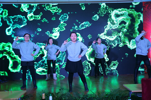 质量部的《小鸡小鸡》是员工的自编舞蹈。由于他们跳舞的模样实在是憨态可掬,让人忍俊不禁。领舞的更是扭动着身躯,好不妖娆,台下观众大呼过瘾!