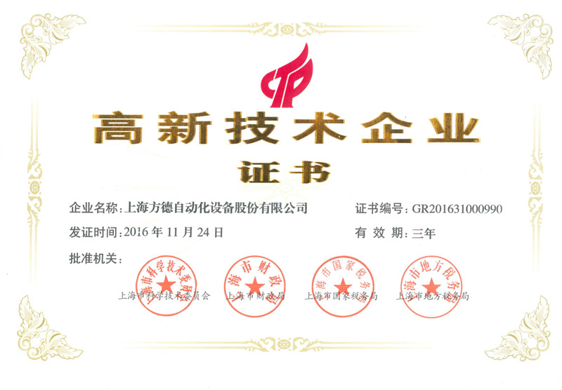 上海方德获得上海科技术委员会颁发的“高新技术企业证书”。