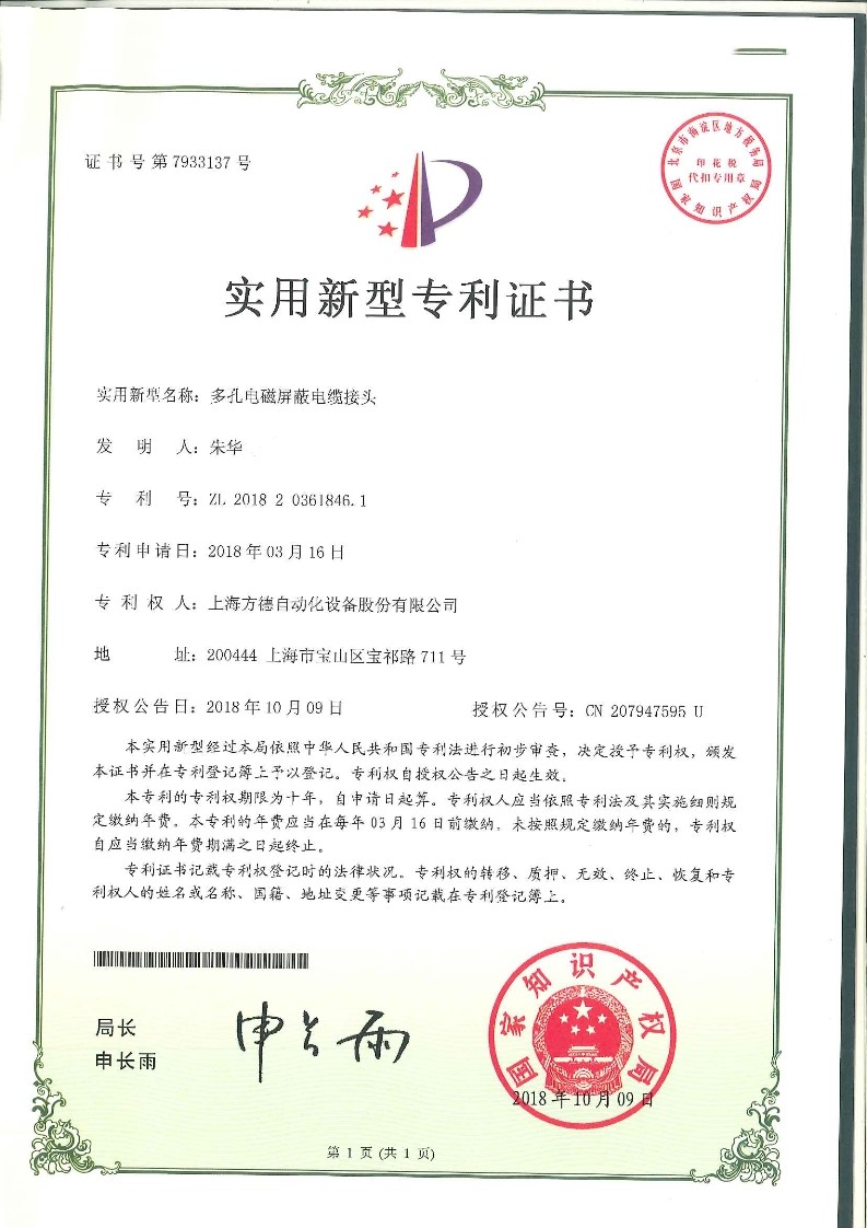 “多孔电磁屏蔽电缆接头”获国家实用新型专利