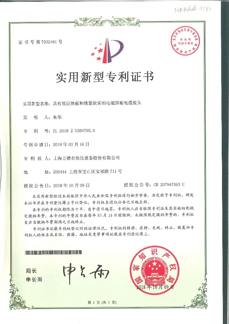 近日,由球王会体育申请的《具有双层屏蔽和锁紧软管的电磁屏蔽电缆接头》实用新型专利